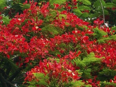 Úgy is ismert, mint a royal Poinciana vagy színpompás fa, láng fa a világ egyik legszínesebb fák. Minden tavasszal a fa termel klaszterek tartós, narancs-piros virágok, sárga, bordó, vagy fehér rajzolat. Minden virágzik, amely méri fel, hogy 5 centi széles, megjeleníti öt kanál alakú szirmokat.